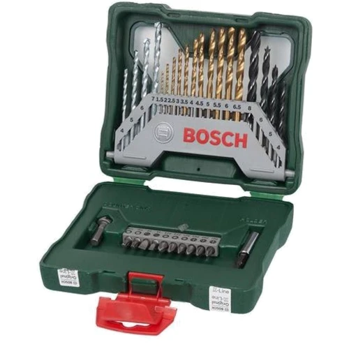 Набор насадок для сверления в древесине, металле, в кирпиче и в камне. Состоит комплект Bosch X-Line-Ti из 30 различных насадок: сверл (11 по металлу — HSS-TIN 1,5-6,5 мм, 4 по камню — HM 4, HM 5, HM 6, HM 8, и 4 по дереву диаметром 4, 5, 6, 7 мм), бит (PH 1, PH 2, PH 3, PZ 1, PZ 2, PZ 3, SL 4, SL 6, Т 20, Т 25), зенкера и универсального магнитного держателя.