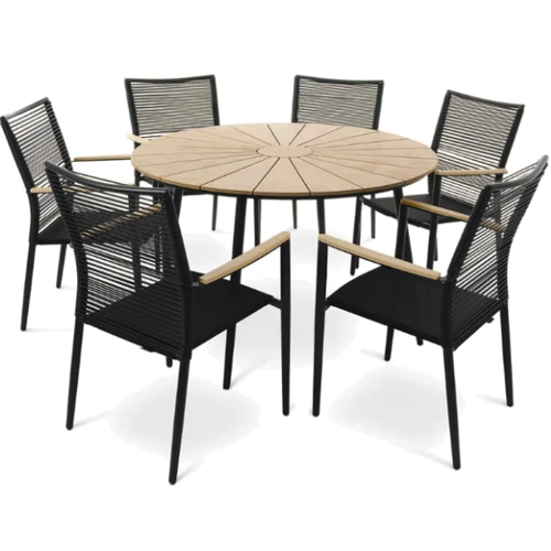 Набор садовой мебели Acona станет идеальным дополнением к любому саду или террасе, обеспечивая не только место для отдыха на природе, но и для организации семейных встреч и вечеринок. Комплект состоит из круглого стола с вместительной столешницей и шести удобных стульев с подлокотниками. Мебель характеризуется высоким качеством изготовления и использованием прочных материалов, устойчивых к влаге и изменяющимся погодным условиям. Гармоничное сочетание легкой, но прочной алюминиевой конструкции, ткани Textilene и техноротанга глубокого черного цвета с контрастными элементами из полива натурального бежевого оттенка придает мебели элегантный, эстетичный вид, благодаря чему мебель Acona идеально вписывается как в классику, так и в модерн. средам.