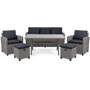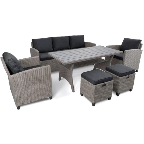 Содержимое комплекта: 1 большой стол, 2 кресла, 2 пуфа, 1 трехместный диван, 7 подушек для сидений, 5 подушек для спинок, монтажный комплект