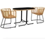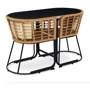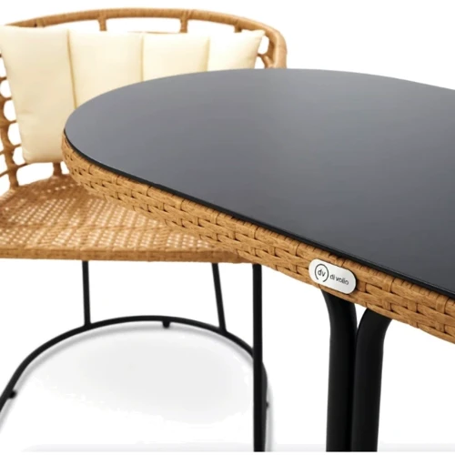 Овальный стол обеспечивает достаточно места, чтобы подать блюда, закуски и напитки во время отдыха на открытом воздухе. Столешница изготовлена из закаленного стекла с сатиновой поверхностью глубокого черного оттенка, она крепкая, водостойкая и легко чистится. Края столешницы окантованы тесьмой из техноротанга контрастного бежевого цвета. Повторяющийся мотив косы придает мебели характерный стиль, сочетающий все элементы гарнитура в гармоничное целое.