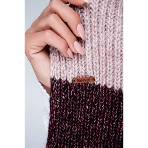 Вязаный комплект состоит из шапки с незафиксированным отворотом, длинного шарфа и митенок с отверстием для большого пальца. Изделия выполнены крупной вязкой из меланжевой смесовой нити.
