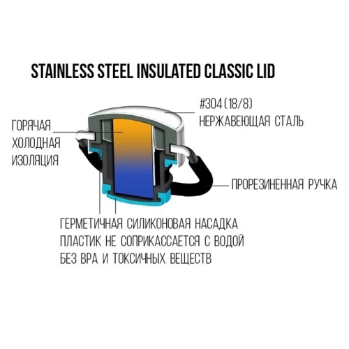 Крышка полностью герметична, вы можете быть спокойными, что напиток не прольется. Благодаря металлической прорезиненной ручке, крышка подходит для удобной переноски. Также его можно закрепить за карабин на рюкзаке.