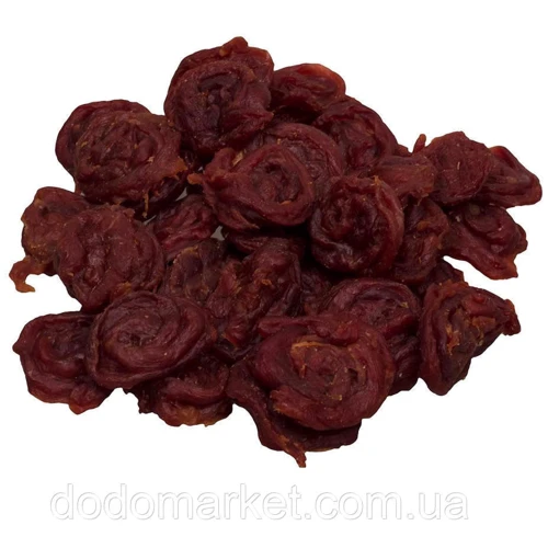 Мягкое кольцевидное филе утки – лакомый кусочек, который можно подавать между приемами пищи. Утиное мясо богато белоком, необходимым для правильного функционирования организма животного, кроме того, лакомство отличается невысокой жирностью. Лакомство — идеальный способ побаловать и вознаградить своих питомцев во время тренировок или прогулок. При производстве не использовались искусственные консерванты.