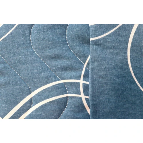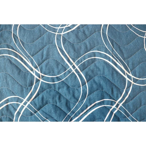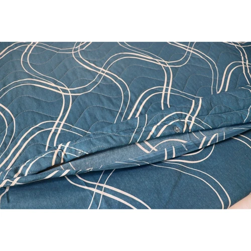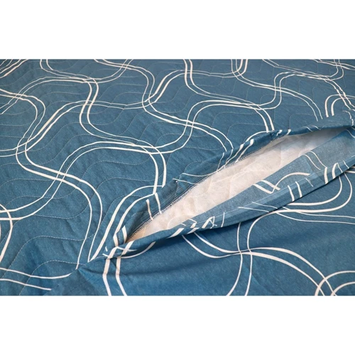 Покрывало-пододеяльник синего цвета с красивыми волнистыми линиями. Стеганное покрывало-пододеяльник 4 сезона - это универсальное мультифункциональное стеганное изделие, которое применяют как покрывало, легкое одеяло или пододеяльник. Это уникальная возможность купить один предмет на все времена года. Его многофункциональность заключается в том, что изделие простегано и имеет вид как полноценное покрывало, а также является обычным пододеяльником на пуговицах. Поэтому в холодное время его можно использовать с одеялом, а в теплое – без одеяла. Покрывало-пододеяльник выполнено из бязевой ткани, простеганной с тонким слоем антиаллергенного полиэфирного волокна холофайбер.