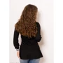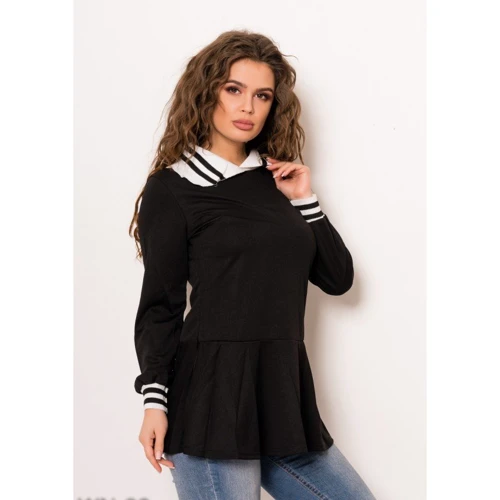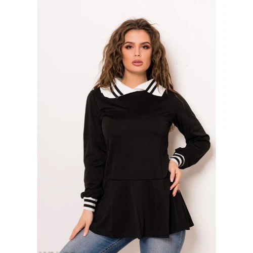 Повседневный лонгслив выполненный с оригинальном стиле с приталенным кроем и удлиненной широкой баской. Модель выполнена из практичного комбинированного трикотажа черного цвета с длинными свободными рукавами на черно-белых полосатых эластичных манжетах. Лонгслив дополнен белым в черную полоску контрастным отложным воротником.