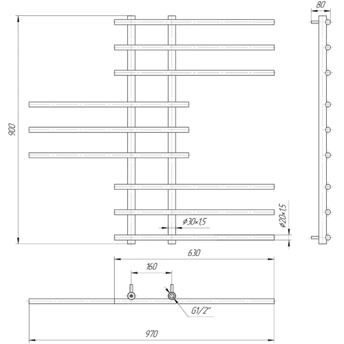 Данная модель полотенцесушителя водяного типа Симфония 900x970/160 отличается внешним дизайном от многих классических моделей благодаря конструктивным особенностям ребер изделия. Горизонтальные накладные перемычки расположены равномерно по три ребра справа и слева от вертикальных центральных осей. За счет такой конструкции использование полотенцесушителя Симфония 900x970/160 становится более практичным и функциональным. Выполнена данная модель из нержавеющей европейской стали AISI 304, высота изделия 900 мм, ширина – 970 мм