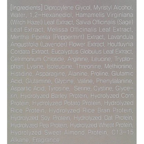 Dipropylene Glycol, Myristyl Alcohol, Water, 1,2-Hexanediol, Hamamelis Virginiana (Witch Hazel) Leaf Extract, Salvia Officinalis (Sage) Leaf Extract, Melissa Officinalis Leaf Extract, Mentha Piperita (Peppermint) Extract, Lavandula Angustifolia (Lavender) Flower Extract, Houttuynia Cordata Extract, Eucalyptus Globulus Leaf Extract, Cetrimonium Chloride, Arginine, Leucine, Tryptophan, Lysine, Isoleucine, Threonine, Methionine, Histidine, Asparagine, Alanine, Proline, Glutamic Acid, Glutamine, Glycine, Valine, Phenylalanine, Aspartic Acid, Tyrosine, Serine, Cystine, Glycerin, Hydrolyzed Barley Protein, Hydrolyzed Corn Protein, Hydrolyzed Potato Protein, Hydrolyzed Rice Protein, Hydrolyzed Rice Bran Protein, Hydrolyzed Soy Protein, Hydrolyzed Oat Protein, Hydrolyzed Pea Protein, Hydrolyzed Wheat Protein, Hydrolyzed Sweet Almond Protein, C13-15 Alkane, Fragrance
