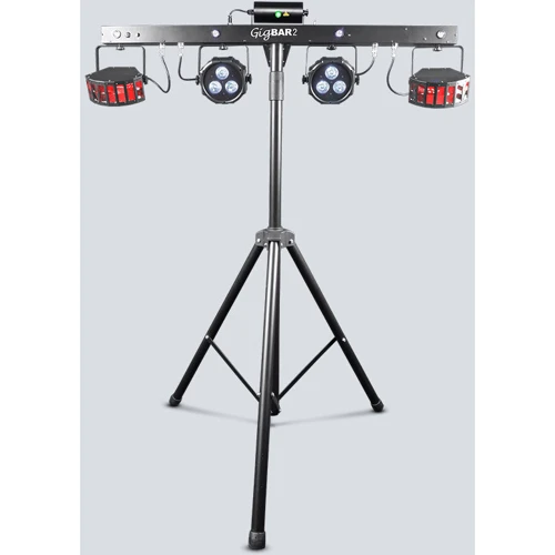 GigBAR 2 - это превосходная мобильная система световых эффектов, включающая заливку с ультрафиолетовым режимом и стробоскоп. GigBAR 2 состоит из двух LED Derby приборов, заливки, лазера и четырех ярких стробоскопов, смонтированных на одной стойке.
