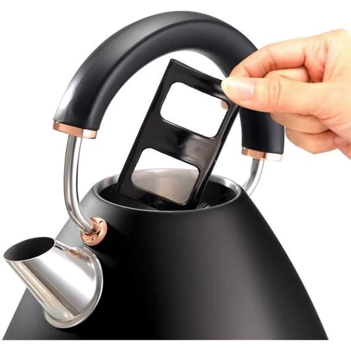 Бытовая техника коллекции Rose Gold выполнена в классическом стиле с элементами отделки под розовое золото, и может по праву стать украшением любой кухни. После закипания чайник издает сигнал, имитирующий звук свистка. Данная функция может быть отключена. Окно уровня позволяет видеть сколько воды осталось в чайнике. При этом дизайн и расположение окна органично вписываются в классический стиль устройства. Стильный внешний вид дополняется встроенным фильтром против накипи, который смягчает воду и гарантирует долговечность устройства. Также чайник снабжен защитой от "сухого" включения.
