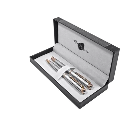 В подавляющем большинстве случаев ценят в подарках практичность, А если это еще и двойная практичность- то, будьте уверены, ваш подарок будет оценен по достоинству и принят с большой благодарностью. Набор ручек Gianni Terra "Silver with Gold" (Серебро с Золотом), состоящий из шариковой и перьевой ручек, сочетает в себе современный стиль и функциональность. Каждая ручка изготовлена с непревзойденным вниманием к деталям. Матовая поверхность серебряного цвета с изящной гравировкой и с деталями золотого цвета подчеркивают престижность этих ручек. Поршневой механизм перьевой ручки при необходимости можно заменить картриджем.