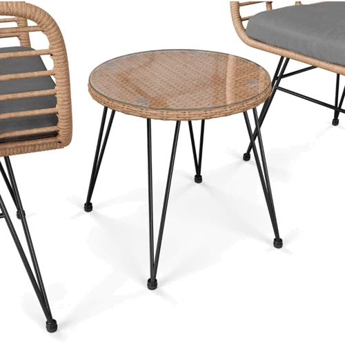 Журнальный столик, как и весь гарнитур, держится на стальных ножках в стиле лофт. Столешница покрыта синтетическим ротангом, а затем закаленным стеклом толщиной 5 мм, которое не только легко поддерживать в чистоте, но также прочное и стойкое к царапинам. Круглая столешница обеспечивает оптимальное пространство для размещения напитков или легкого фуршета.
