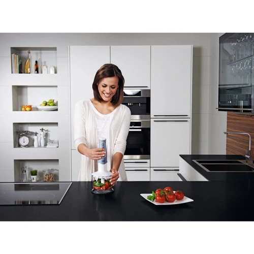 Этот аксессуар имеет объем 500 мл, он идеально подойдет для использования с моделями из серий Multiquick 5, 7 и 9 с металлической ногой. Измельчитель выполнен из прочного безопасного пластика, обладает нескользящим основанием, которое помогает прочно фиксировать его на поверхности стола во время работы. Его можно без проблем мыть в посудомоечной машине. С приобретением этого маленького аксессуара вы сможете готовить любимые блюда быстро и без лишних хлопот.