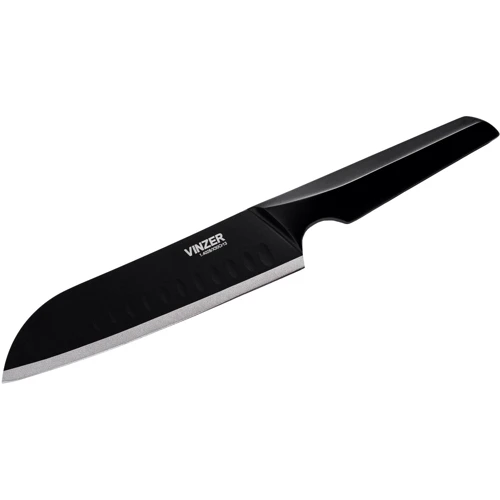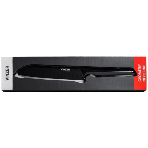 Нож сантоку с длиной лезвия 7 дюймов (17.8) и толщиной 2.5 мм. Изготовлен из высокоуглеродистой стали 1.4028/X30Cr13, благодаря чему надолго сохраняется острота лезвий. Очень удобная литая ручка из нержавеющей стали. Можно мыть в посудомоечной машине.