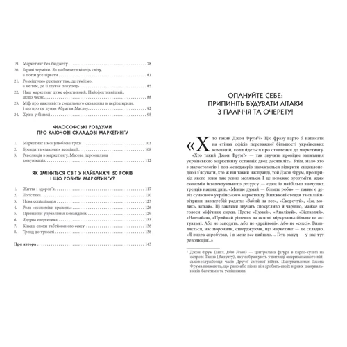 Друга частина книги присвячена філософським проблемам маркетингу — зокрема тому, як він створює цінність, що задовольняє запити споживачів і сприяє процвітанню компаній. Спираючись на фундаментальні засади засвоєння інформації, автор ділиться власним багатим досвідом будівництва успішних брендів. Третя частина книжки пропонує читачеві зазирнути в недалеке майбутнє за допомогою вже наявних трендів, що в найближчі десятиліття радикально змінять суспільство, споживання і ринки.