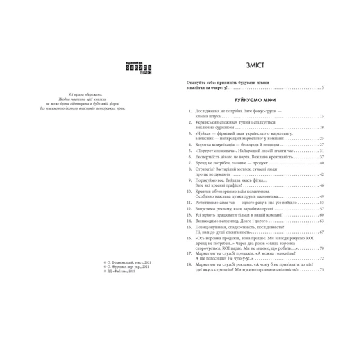 Ми живемо в країні, де переміг «карго-маркетинг» — маркетингу що спирається на міфи і фікції. Деяким бізнесам комфортно в обіймах цього культу, але рано чи пізно зіткнення реальності та міфології призводить до руйнівних наслідків. Олексій Філановський, відомий український маркетолог, на сторінках цієї книжки аналізує найпоширеніші бізнес-міфи і пропонує прості і прозорі методи та інструменти, що допоможуть налагодити справді ефективну роботу маркетингу.