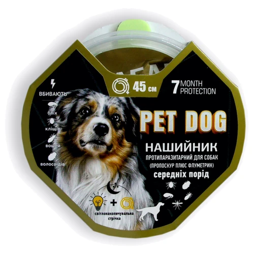 Противопаразитарный ошейник «Pet Dog» для собак крупных пород. Представляет собой полимерную ленту длинной 70 см. со специфическим запахом составляющих компонентов, обладающей светонакопительными свойствами (светится в темноте). Ошейник является современным инсектоакарицидным средством. Он обеспечивает эффективное лечение и надежную профилактику заражения собак крупных пород внешними паразитами на всех стадиях развития.