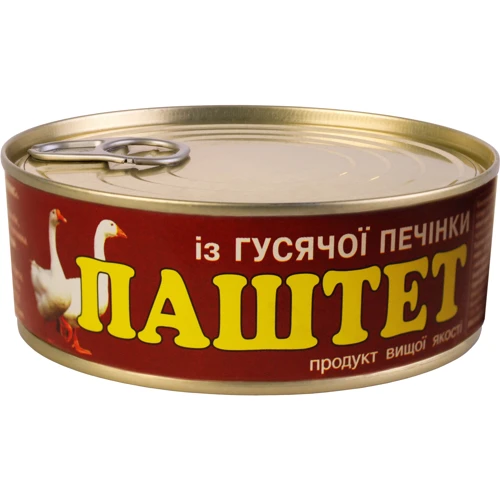 печень гусиная 45%, жир свиной 30%, лук репчатый 12%, яйца куриные 5%, крахмал картофельный, соль поваренная пищевая, перец черный молотый