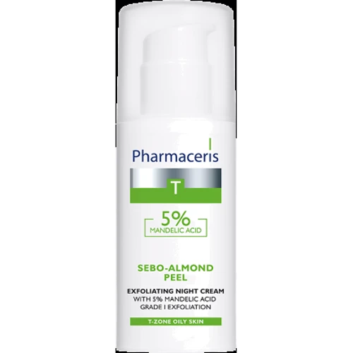 Ночной крем-пилинг Pharmaceris T Sebo-Almond-Peel Exfoliting Night Cream это лечебный и профилактический препарат для устранения угревой сыпи, акне и других заболеваний кожного покрова. Представленный продукт содержит лимонную кислоту, которая великолепно разглаживает кожный покров, осветляет его и придает ровный, матовый оттенок. А натуральная миндальная кислота отшелушивает омертвевшие клетки дермы, прочищает забитые поры и устраняет саму причину возникновения угрей и чрезмерного секреции сальных желез.
