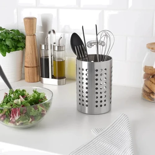 Выше, чем подставка для столовых приборов. Подходит для хранения больших кухонных принадлежностей.