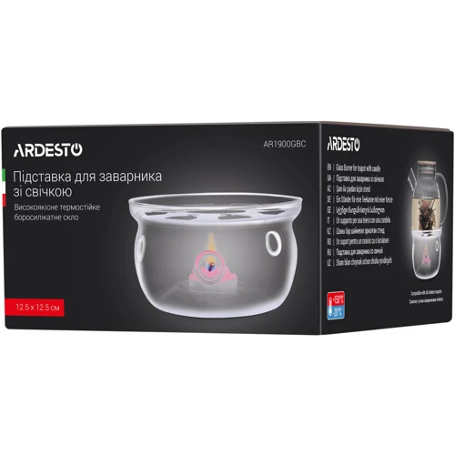 Подставка для чайника со свечой изготовлена из прозрачного боросиликатного стекла и совместима со всеми чайниками ARDESTO. Диаметр изделия 12.8 см, высота 6.4 см. Подставка термостойкая: выдерживает колебания температуры от -20 до +150°С. Его можно мыть в посудомоечной машине.
