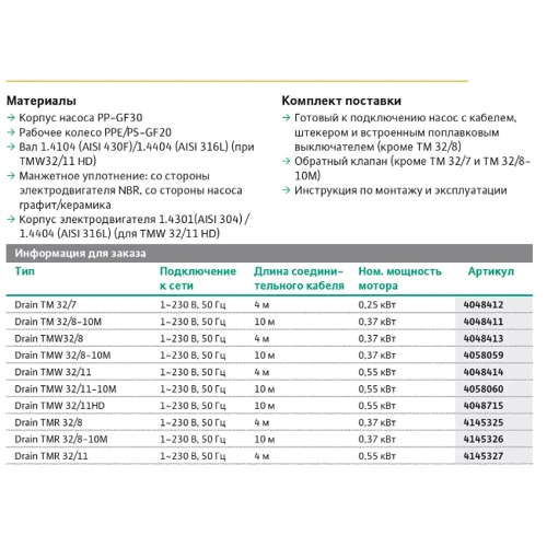 Дополнительная информация: погружной дренажный насос; перекачивание следующих сред: предварительно очищенные сточные воды без фекалий и длинноволокнистых фракций, загрязненная вода; минимальный уровень остаточных вод 2 мм для абсолютной надежности; эргономичная ручка для переноски, небольшой вес, готовое к подключению исполнение (Plug & Pump); эксплуатационная надежность благодаря встроенному охлаждающему кожуху, торцовому уплотнение с камерой уплотнений и электродвигатель, помещенный в кожух из нержавеющей стали; длина кабеля в зависимости от типа от 3 до 10 м; температура перекачиваемой жидкости макс. 90° C; напорный патрубок - G 1¼.