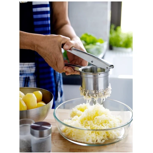 Картофельное пюре — прекрасный гарнир и к мясу, и к рыбе. Приготовить его вам поможет этот прочный кухонный прибор из нержавеющей стали. Просто положите отварной картофель в пресс и выдавите через маленькие отверстия.