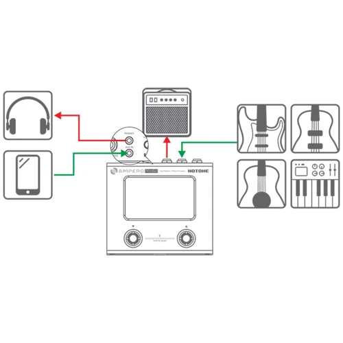 Подключите стереокабель типа "male-to-male" 1/8" от источника звука (телефона или музыкального плеера) к разъему Aux Ampero Mini. На эту линию не будут влиять внутренние эффекты Ampero Mini и аудиосигнал USB.
