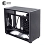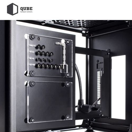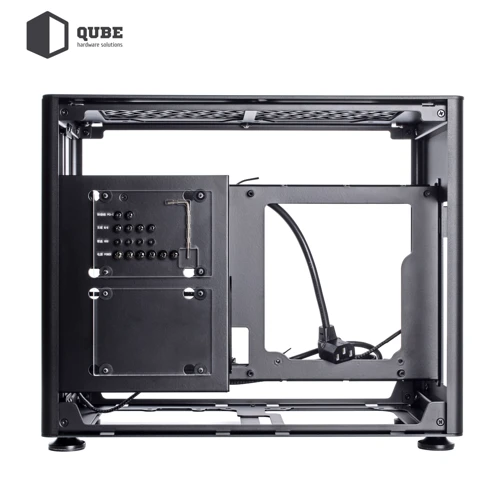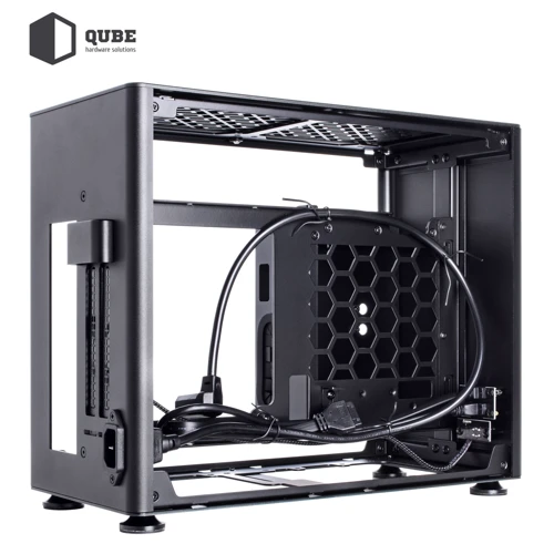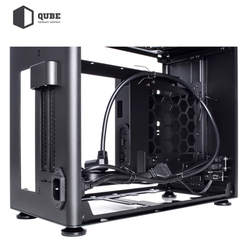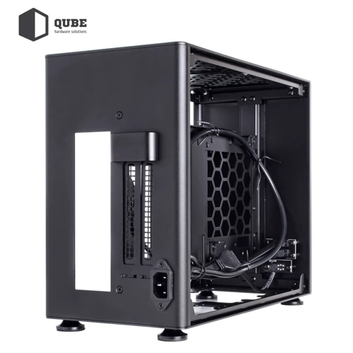 Из коробки корпус QUBE A4 поставляется без предустановленных вентиляторов. Пользователь по желанию сможет инсталлировать 4 кулера: сверху 2x120 мм; снизу 2x120 мм. Присутствует поддержка систем водяного охлаждения (СВО) длинной до 240 мм. Кейс оснащен блоком питания на 600 Вт, для которого предусмотрено место за задней панелью. Там же можно аккуратно организовать прокладку кабелей.