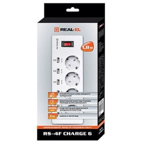 Сетевой фильтр-удлинитель REAL-EL RS-5F Charge 6 со встроенным USB зарядным устройством предназначен для подключения к электрической сети электроприборов и обеспечения их защиты от высоковольтных импульсов напряжения и постоянной фильтрации высокочастотных помех.