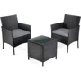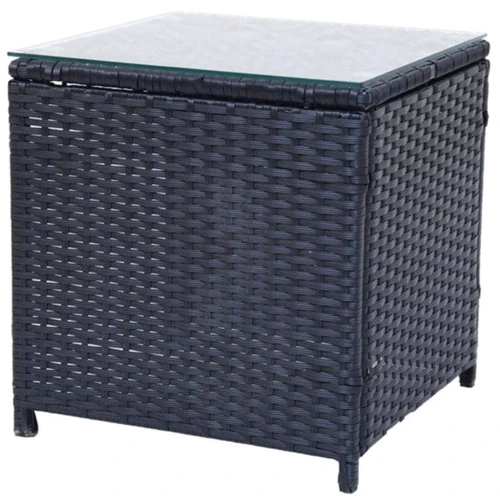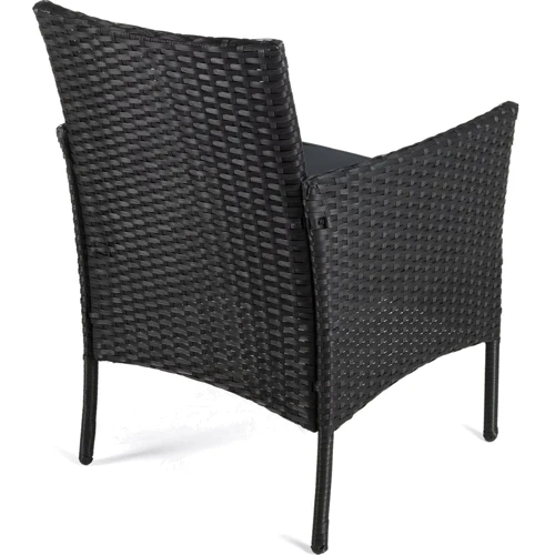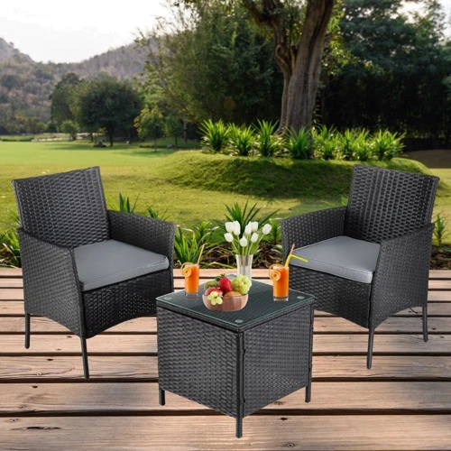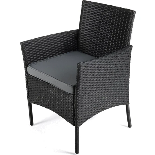 Садовая мебель состоит из двух стильных кресел, небольшого столика с прочной стеклянной столешницей, удобных подушек с защитными чехлами и крепежных элементов для сборки.