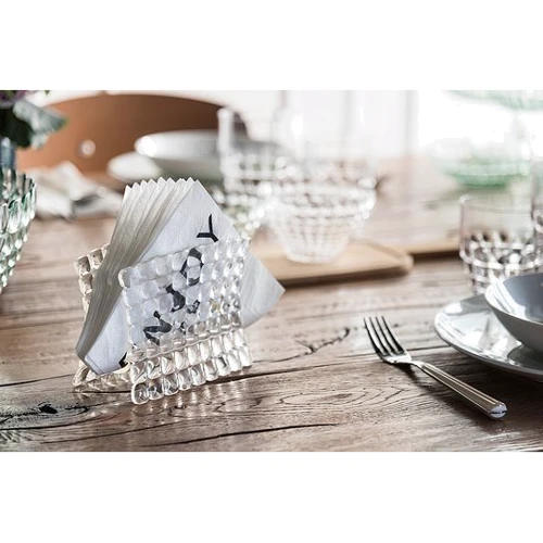 Рельефная форма в сочетании с прозрачным материалом заставляет поверхность сверкать и переливаться на свету, поэтому салфетница будет особенно хорошо смотреться на летней веранде на даче.