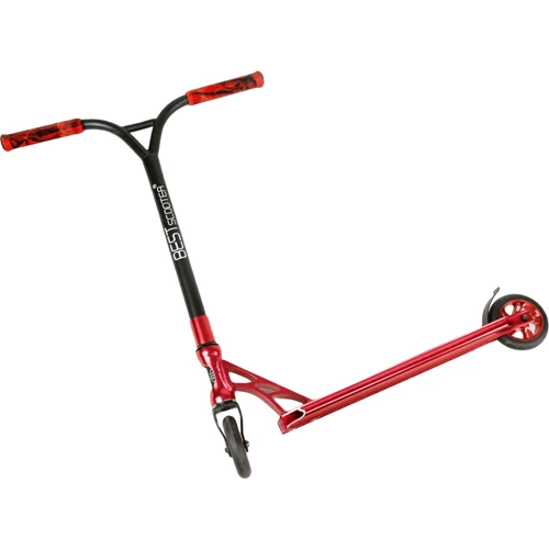 Колеса модели, как и положено трюковому самокату, маленькие в диаметре (всего 11см) с большой жесткостью, выполнены из PU. Диски алюминиевые. Подшипник типа ABEC 7 делает самокат по-настоящему скоростным и удобным для разгона во время выполнения трюков. Достаточно длинная узкая дека покрыта специальной шкуркой, которая обеспечит лучшее сцепление ноги райдера с ней. Накладки на руль, иными словами грипсы, у данного самоката выполнены из прочного нескользящего материала.