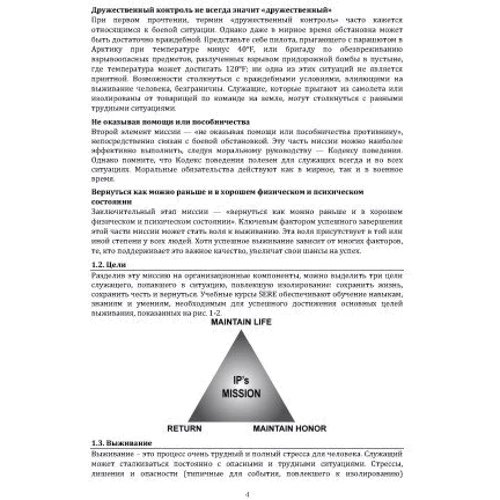 В этом справочнике описываются различные условия окружающей среды, влияющие на выживание человека, а также действия изолированного персонала (IP), необходимые для выживания во время выхода из-под удара противника или событий, повлекших к изолированию человека. Это основной справочный документ, содержащий руководство для любого военнослужащего ВВС США, который может оказаться в изоляции; любые отклонения требуют тщательного обдумывания и рассмотрения.