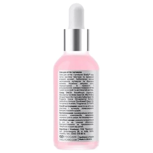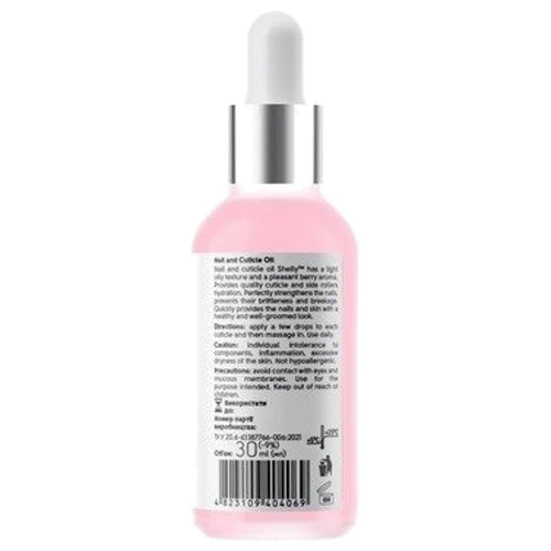Масло для ногтей и кутикулы Shelly станет незаменимым помощником как для опытного мастера в салоне, так и для домашнего использования. Имеет легкую масляную текстуру и приятный ягодный аромат. Комплекс активных компонентов мгновенно насыщает кутикулу, боковые валики и ногтевую пластину необходимой влагой и полезными витаминами. Масло отлично укрепляет ногти, препятствует их ломкости и расслоению. При регулярном использовании масло быстро вернет ногтям здоровый и ухоженный вид. Благодаря компактному флакону масло можно брать с собой в любое путешествие и использовать в удобном для вас месте.