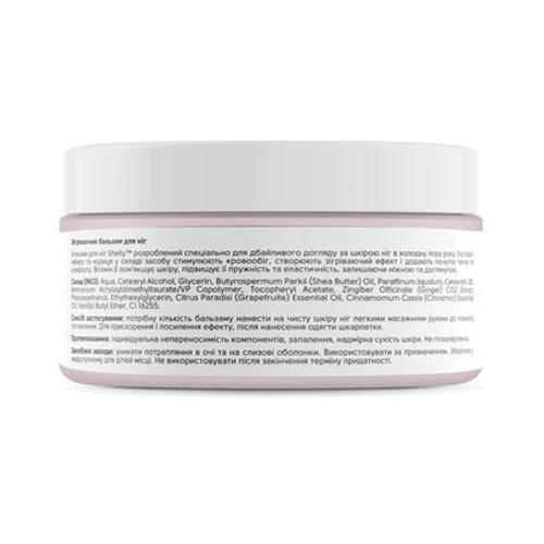 Зимой кожа ног требует не менее бережного ухода, чем в теплое время года. Инновационный бальзам для ног Shelly согреет ваши ножки даже в холодную погоду, подарит коже приятное чувство тепла и комфорта. Бальзам улучшает кровообращение, эффективно ухаживает за кожей стоп, смягчает, увлажняет и делает ее гладкой. Идеально подойдет для тех, у кого часто мерзнут ноги.
