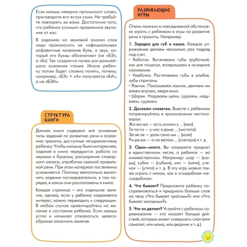 Вместе с гномиком Лучиком ребенок проработает ключевые навыки, решая разнообразные речевые и грамматические задачки. Задания расположены по мере усложнения, что делает процесс обучения еще более полезным и доступным для ребенка. Большое количество наклеек в этой книге не даст ребенку потерять интерес к занятиям, а главное, он обязательно получит удовольствие от учебного процесса.