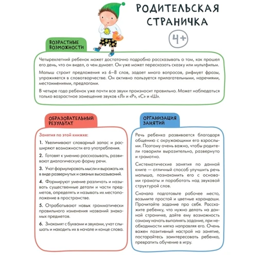 Книга «Речь, грамота 4+» из серии «Школа Семи Гномов. Активити с наклейками» предназначена для развития и тренировки грамотной речи у детей от 4 до 5 лет.