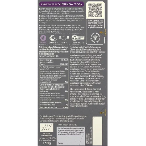 какао тертое 62,13% (конго), сахар сырой тростниковый 29,13% (парагвай), какао-масло 8,74% (доминиканская республика). Может содержать следы миндаля, арахиса, других орехов и молока (лактозы).