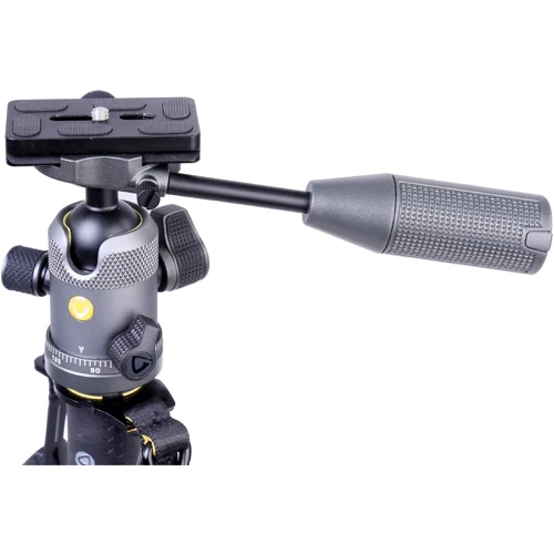 VEO 2 BP-50. Монопод укомплектован шаровой головкой VEO 2 BP-50, обладающей более высоким функционалом, чем традиционные шаровые головки. Благодаря наличию отдельного фрикционного зажима и съемной телескопической ручки, данную модель удобно использовать в качестве 2D видеоголовки, а также для съемки панорам. Фрикционный зажим ограничивает движение головки только по двум осям. Кнопка на рукоятке позволяет делать ручку длинней либо короче. Фиксаторы шара и поворота головки имеют эргономичную форму и агрессивную профилированную накатку для удобства управления и надежной фиксации. Основание головки имеет градуированную позиционную площадку для точности поворота. Головка рассчитана на нагрузку до 6 кг и оснащена быстросъемной удлиненной площадкой QS-71 стандарта Arca-Swiss, что позволяет работать с объемным и более тяжелым оборудованием, таким как подзорные трубы, DSLR-камеры с длиннофокусными объективами.