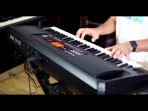 KORG EK-50 имеет 61 динамическую клавишу синтезаторного типа. 64-нотной полифонии вполне достаточно для того, чтобы новичок мог осваивать процесс создания аранжировки. Движком инструмента является стереофонический генератор PCM. Заводской набор включает 702 тембра и 41 набор ударных. Функция Set List позволяет упорядочить выбранные тембры, что значительно облегчает их переключение в реальном времени. 280 стилей автоаккомпанемента позволяют создавать и исполнять музыку в различных жанрах. Цифровые эффекты (34 типа) делают игру более интересной и разнообразной. Встроенный рекордер дает возможность записать свое исполнение и сохранить на съемный носитель памяти.
