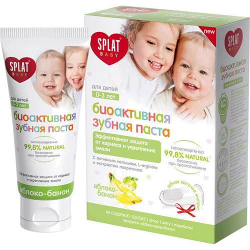 В составе пасты содержится экстракт лакричника, который препятствует повторному образованию налета. В детской зубной пасте нет вредных компонентов, ее эффективность и полезные свойства доказаны на основе клинических исследований. Это превосходная защита от кариеса и помощь при прорезывании первых маленьких зубиков. Подарите вашему малышу ароматную защиту Splat Kids cо вкусом яблока и банана!