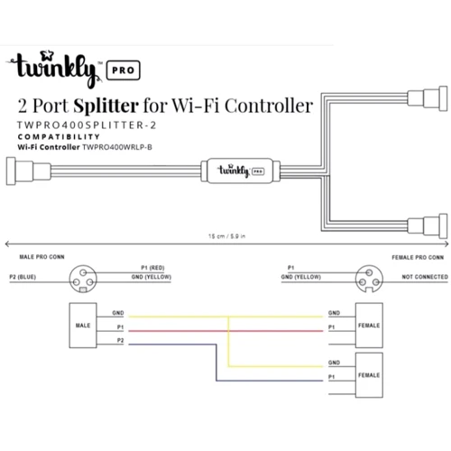 Twinkly PRO 2 Port Splitter совместимый с Wi-Fi контроллером TWPRO400WRLP-BEU и применяется для разделения линии на две при подсоединении светодиодных управляемых гирлянд Twinkly PRO.