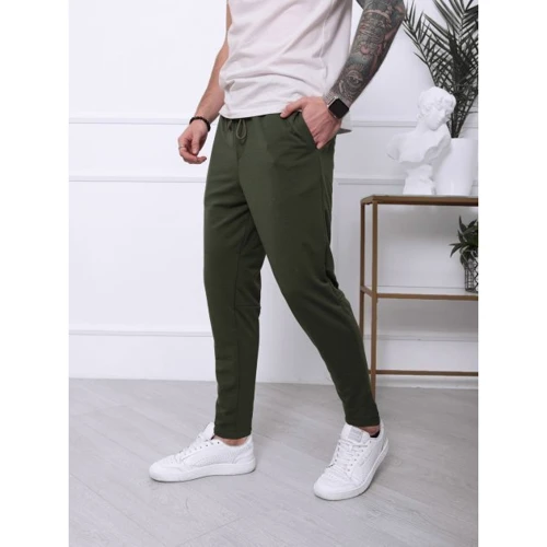 Спортивные брюки свободного зауженного к низу кроя с поясной резинкой и шнурком. Модель выполнена из двухнитного трикотажа с потайными боковыми карманами. Сзади модель оснащена накладным карманом из черной плащевки с клапаном.