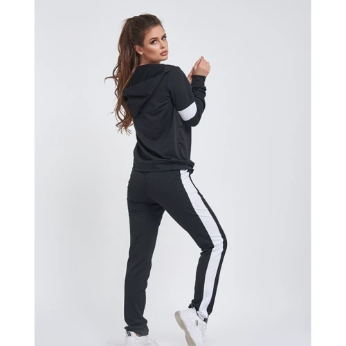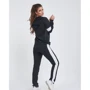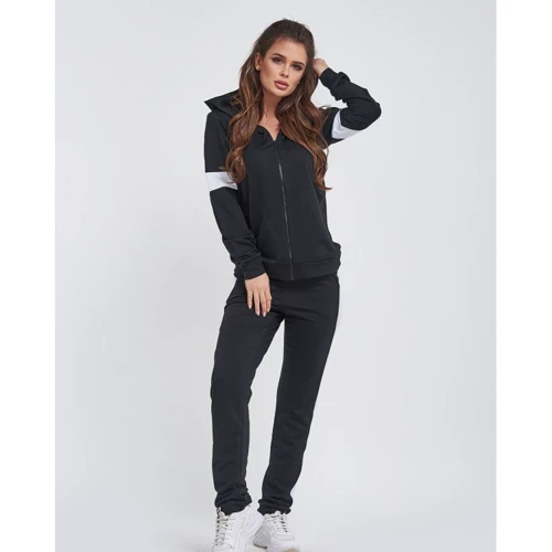 Черный демисезонный спортивный костюм из трикотажа декорированный белыми вставками и лампасами на брюках.