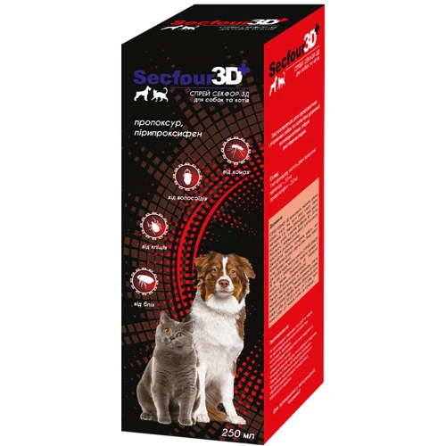 Спрей против блох и клещей для кошек и собак Secfour 3D – мгновенная защита от паразитов еще до нападения! Три мощных уровня защиты благодаря 3 действующим веществам: этофенпроксу, фипронилу и пирипроксифену. Препараты уничтожают паразитов до укуса. Нокдаун эффект в течение 2 минут! Паралитическое действие препарата не позволяет клещу передвигаться животным и выбирать место для укуса. Защищают животное от заражения до 8 месяцев; прекращает развитие популяции паразитов в стадии яйца и личинки. Нокдаун эффект в течение 2 минут! Паралитическое действие препарата не позволяет клещу передвигаться животным и выбирать место для укуса.