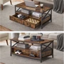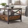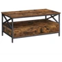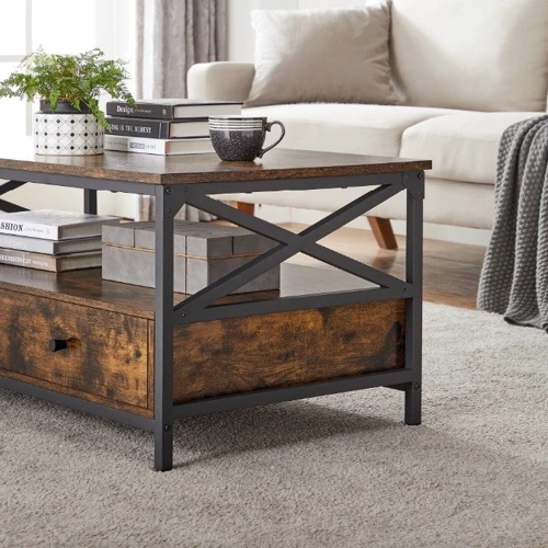 Стол, стилизованный под старину, сочетает в себе деревянную столешницу с деревенским коричневым оттенком и прочную металлическую конструкцию.
