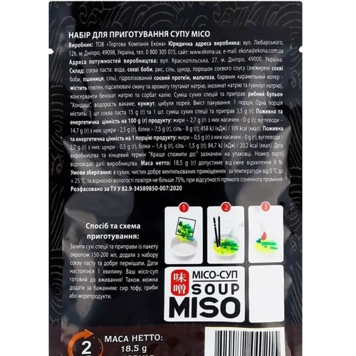 Состав: Соевая паста: вода, соевые бобы, рис, соль, сахар, порошок соевого соуса (обезжиренные соевые бобы, пшеница, соль), гидролизованный соевый протеин, мальтоза, краситель карамельный цвет - содержит глютен, усилитель вкуса и аромата глутамат натрия), консерванты бензоат натрия и сорбат калия. Смесь сухих специй и приправ: рыбный бульон "Хондаши", водоросль вакаме, кунжут, лук порей.