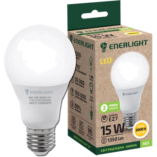 Светодиодная лампа ENERLIGHT A65 15Вт 3000K E27 выполнена в классической форме. Это лампа универсального применения и может использоваться как для внутреннего, так и для наружного освещения жилых помещений. Лампа ENERLIGHT A65 15Вт имеет высокий показатель светового потока и энергоэффективности а качественный IC драйвер обеспечивает бесперебойную работу в условиях небольших колебаний напряжения в сети. Лампа с цветовой температурой 3000К имеет теплый желтый оттенок комфортный для жилых комнат, уютный для вечерней атмосферы, спальни. Удачное решение для использования в торшеров, бра и прикроватных светильниках.