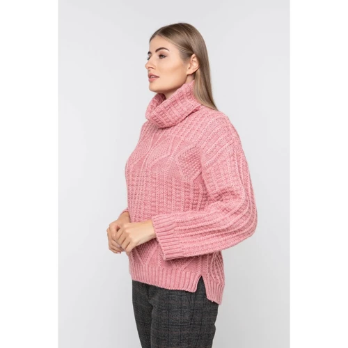 Свитер с комбинированным узором. Изделие выполнено из объемной, мягкой и теплой пряжи. Крой свободный, с краями разной длины и боковыми разрезами. Высокая горловина. Спущенные плечи. Рукава 7/8 широкие. Края связаны крупной резинкой. Длина изделия по полочке - около 59 см, по спинке - около 62 см.