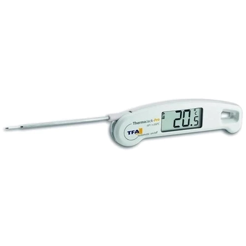 Этот складной термометр от TFA идеально подходит для простого измерения температуры в самых разных областях. Мониторинг температуры внутри мяса во время барбекю или жарки, проверка безопасной температуры детского питания, приготовление пищи в пекарне, кондитерских изделиях или в сфере общественного питания, управление прилавком - холодильником в мясной лавке или в супермаркете, проверка склада или входящий товарный осмотр в столовой, на кухне или в пищевой промышленности - вот все возможные варианты использования «THERMO JACK PRO». С помощью этого удобного термометра можно быстро, точно и без усилий измерять пищу всех видов. Практичный механизм складывания облегчает использование. Разверните датчик, вставьте его в то, температуру чего необходимо проверить, и в течение короткого времени прибор покажет точную температуру. Просто сложите его обратно после использования, и он сразу выключится. Положите его в карман брюк, и вам будет легко достать его до следующего использования. Термометр соответствует требованиям HACCP и EN 13485 и хорошо подходит для профессионального использования в промышленности, розничной коммерции, торговле и лаборатории. Благодаря специальному измерительному наконечнику, THERMO JACK PRO точно измеряет температуру всего за 4 секунды. Устройство является водонепроницаемым и может быть очищено под струей воды после использования.